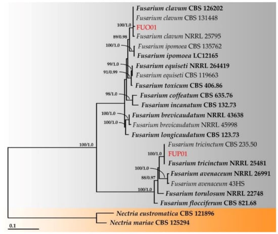 The combined sequence of ITS, rpb2 and tef1 were used to identify the Fusarium species. This dataset consisted of 23 taxa, and the aligned dataset was comprised of 2093 characters, including gaps (ITS: 1–612; rpb2: 613–1463; and tef1: 1464–2093). ML analysis of the combined dataset yielded a best scoring tree with a final ML optimization likelihood value of –5512.3754. The matrix contained 402 distinct alignment patterns with 11.46% undetermined characters or gaps. The estimated base frequencies were recorded as follows: A = 0.2585, C = 0.2883, G = 0.2508, and T = 0.2323; substitution rates of AC = 1.1126, AG = 2.6234, AT = 1.0772, CG = 0.4744, CT = 7.1567, and GT = 1.0000; and gamma distribution shape parameter alpha = 0.4065. The tree length value was equal to 0.4086. In addition, the final average standard deviation of the split frequencies at the end of the total MCMC generations was calculated to be 0.00642 through BI analysis. The phylograms of the ML and BI analyses were similar in terms of topology (data not shown). The phylogram obtained from the ML analysis is presented in Figure 6. Fungal strains FUO01 and FUP01 were assigned to the monophyletic clades of F. clavum and F. tricinctum, respectively, each clade having high BS (100%) and PP (1.0) supports.