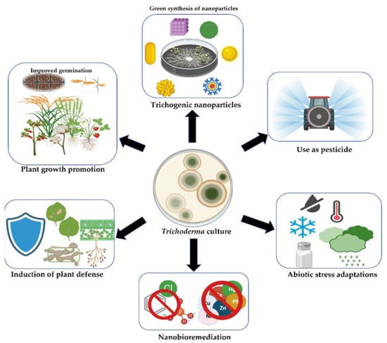 Many studies have indicated that Trichoderma spp. are particularly efficient at degrading pesticides and can be useful in an integrated pest control strategy as well as for reducing pesticide residual effects. Trichoderma spp. have been reported to degrade benzimidazole fungicide (Carbendazim) [], chlorpyrifos [], penthiopyrad [], and 2,2-dichlorovinyl dimethyl phosphate (DDVP) []. Wu et al. [] proposed the tolerance mechanism of T. asperellum TJ01 to dichlorvos. Trichoderma spp. produce a variety of volatile organic compounds (VOCs) possessing various chemical properties. These metabolites are critical in agricultural, food, and pharmaceutical applications []. T. reesei has not been proven to be hazardous to humans []. The biosynthesis of silver nanoparticles by the fungus T. reesei is preferable in terms of safety, economics, and large-scale production capability []. As a result, the use of Trichoderma should be encouraged since it offers sustainable agriculture by minimizing the use of hazardous chemicals in agriculture (Figure 2).