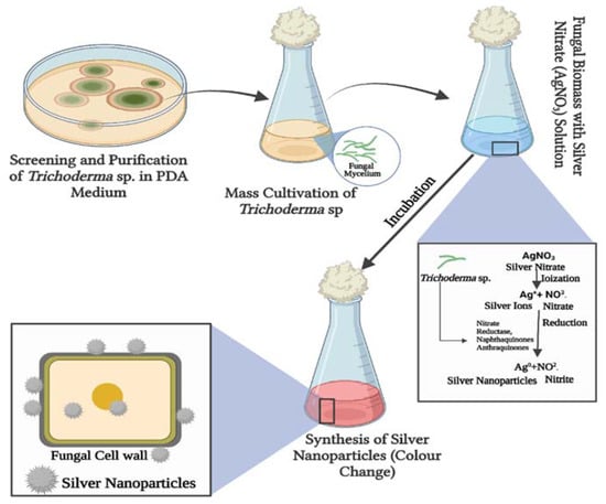 Schematic illustration of biosynthesis mechanism of silver nanoparticles (AgNPs) using Trichoderma species. The present figure was created by BioRender.com.
