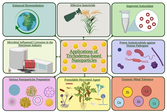 Crop production invariably involves rampant use of chemical pesticides, insecticides, and herbicides that have been exhibiting bioaccumulation of toxic chemical residues potentially hazardous to plant ecosystems []. This problem has shifted the research foci to the identification of more effective alternatives such as nano-based agrochemicals. The intrusion of nano-interventions in the agri-food sector is being extended to extract the benefits showcased by nanotechnology applications in electronics, pharmaceutical, biomedical, paint, and cosmetics industries. However, the chemically synthesized nanoparticles have a high cost and substantial eco-toxicity (https://www.reportlinker.com/p06193716/Nanotechnology-Services-Global-Market-Report.html?utm_source=GNW, accessed on 20 February 2022). Their rampant use in open field conditions is anticipated to enhance the negative ecological and health hazards, besides the huge input costs. Therefore, green nanoparticles have been speculated to address these issues related to synthetic NPs. Various fungal species may create mycogenic nanoparticles that might stimulate growth and protect crops against diseases in some prospective agricultural uses through antioxidant, antimicrobial, and plant-stimulating properties. The primary benefits of the mycogenic NP synthesis protocol(s) will be the one-pot, cost-effective, and less environmentally corrosive features. Still, the widespread usage of myco-nanoparticles may lead to a few complications. For example, on multiple applications of these NPs, the nano-toxicity aspects will render the plant beneficial microbes vulnerable to the applied nanoparticles, which might compromise their viability as well as the biocontrol and plant growth promotion benefits. Farms and agricultural consumers will soon be able to utilize myconano-functional agrochemicals, pre-harvest and post-harvest crop protection agents, sensors used in genetic equipment, and crop protection components. Additionally, the fungus-derived nanoparticles can function as useful myco-nano-sorbents and would be an attractive way to perform heavy metal biosorption from contaminated wastewater. The employment of Trichoderma genus for the synthesis of metallic nanoparticles is ecologically advantageous, time-saving, and cost-effective. Furthermore, potential agrochemicals can be designed by amalgamating NPs and Trichoderma strains to produce more sustainable products. The agri-food applications of this technology outlined below will help you understand how the Trichoderma genus is used to make nanodevices and how these trichogenic NPs are being used in various applications.