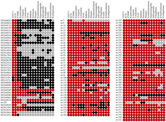 Occurrence of 117 orthologue [D1,2] stwintrons at the same gene position in 17 taxa of Hypoxylaceae. Four genomes in the Daldinia genus—D. eschscholzii, Daldina sp. EC12, D. childiae and D. concentrica—were considered as one taxon. The red circles indicate that the stwintron position confirmed in Hypoxylon sp. CO27-5 is also occupied by a [D1,2] stwintron in the intron–exon structure of the orthologue gene in another species or strains of Hypoxylaceae. The black circles indicate that the CO27-5 stwintron position was not occupied in the orthologue gene in another species or strains. The grey circles indicate the absence of the orthologue gene in other species or strains. Twenty-four of the 25 full sister stwintrons (named as in [25]) exclusively occurred in the strongly related strains CO27-5 and/or EC38 with four sister stwintrons unique to either CO27-5 or EC38. For almost all of the 81 newly reported, uniquely occurring (UO) stwintrons, occupation of the stwintron position was not restricted to Hypoxylon sp. CO27-5 or EC38. Note that for stwintron number no-274, the [D1,2] stwintron changed to the [D5,6] configuration at the very same position in H. rickii, H. fragiforme and H. lienhwacheense (see Section 3). The genome resources used in this work are identified by their unique master genome accession number in Table 1 along with the original literature reporting on these resources. All genomes are freely accessible at NCBI.