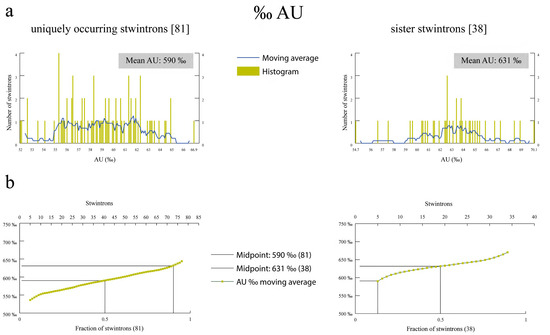 The AU content of sister stwintrons is consistently higher than that in the miscellaneous group of evolutionary older, uniquely occurring stwintrons. (a) shows the crude data in histogram form specifying the number of stwintrons with one particular AU content rounded to units permille (‰). A moving average of the AU content over a window of nine consecutive permillages (number of AU/number of nt for each stwintron × 1000) was calculated for single step increments in AU content (blue line). In (b), incrementing moving averages of AU content (green data points) were plotted against the fraction of stwintrons for each of the two groups. The mean AU content in each group of stwintrons (permillage AU at stwintron fraction 0.5) was indicated with horizontal and vertical lines in both panels.