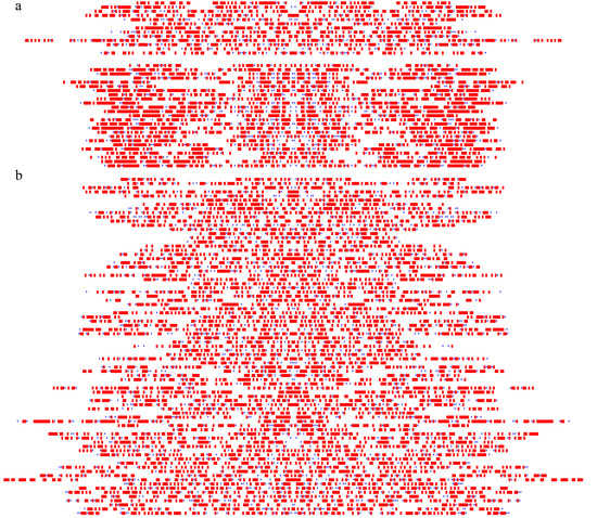 We studied internal symmetry with the same simple means (see above) in the 81 UO stwintrons newly identified and found that without exception, some level of sequence symmetry could be detected (Figure 6: panel a, the “control” group of 38 sister stwintrons; panel b, the 81 UO stwintrons). Using different alignment programs, often two different centres of symmetry were apparent in the same stwintron. This could be a reflection of the dynamics of RNA secondary structure, locating different or alternative internal stem-loop structures, either mutually exclusive or concurrent, in the core of the intervening sequence.
