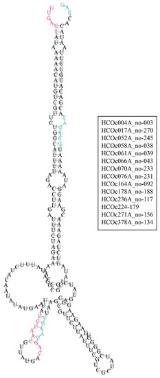 Optimal secondary structure prediction of a consensus sister stwintron deduced from a multiple sequence alignment. The RNAalifold program predicts the folding of a consensus RNA sequence derived from a Multiple Sequence Alignment of a set of sequence-similar RNAs. The basis of the Figure is the MAFFT alignment of the 23 Hypoxylon sp. CO27-5 sister stwintrons shown in our previous publication (cf., [25], Figure 2 therein). Two of the most sequence divergent stwintrons (i.e., HCOc002A and HCOc552A) were omitted. Positions where nts were present in only one or two of the sequences were eliminated from the alignment. Base deletions specific to some of the stwintrons were addressed: seven additional sister stwintrons were excluded from the alignment as they present single gaps bigger than 3 nt. The resulting “consensus” sister stwintron was 205 nt in length and based on the 14 most similar sister stwintrons (listed in the inlet at the right). RNAalifold (default settings, except that isolated base pairs were not avoided) predicted the secondary structure of this consensus [D1,2] sister stwintron. The canonical sequences of the conserved 5’-donor, BP sequence element, and 3’-acceptor of its internal intron are printed in magenta letters. The canonical sequences of the conserved 5’-donor—split by the internal intron between G1 and U2—BP sequence element, and 3’-acceptor of its external intron are printed in turquoise letters.The minimum free energy ΔG for this folding was –68.71 kcal/mol (–27.16 kcal/mol from covariance contributions).