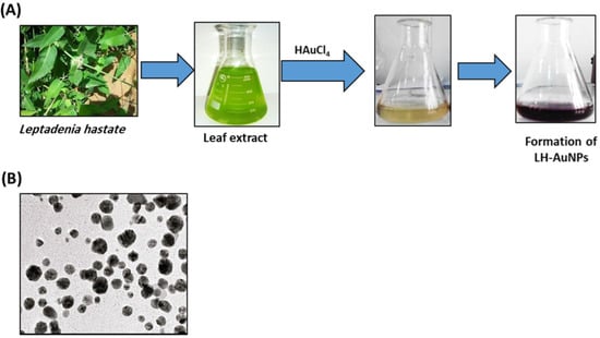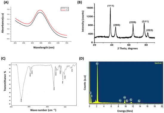 TEM displayed LH-AuNPs particles about 5–30 nm in size with spherical-, hexagonal-, and triangular-shaped appearances. AuNPs with these distinctive structures have previously been described []. In addition, the EDX and XRD analyses verified the presence of AuNPs and their typical metallic gold nano-crystalline structural configurations. It was reported that both the hydroxyl and carbonyl groups are accountable for the stabilization of gold nanoparticles []. Our FTIR spectra displayed peaks related to OH and carbonyl groups capped the nanoparticle surfaces. These results are in agreement with reported results of biosynthesized AuNPs using Tetraselmis suesica [].
