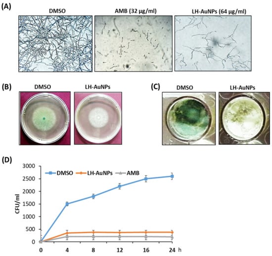 We examined the antifungal activity of AMB and LH-AuNPs against A. fumigatus using an MTT assay. After 48 h of incubation, the results showed that, with increasing concentrations, the growth of A. fumigatus was significantly inhibited. At concentrations greater than 32 and 64 μg/mL, no fungal colonies were visible in the case of AMB and LH-AuNPs, respectively (Figure 3A). Thus, we concluded that the MIC of LH-AuNPs was 64 μg/mL. The inhibitory effect of AMB and LH-AuNPs was also observed using inverted microscopy. A strong visual difference in mycelia density and growth was detected among treatments (Figure 3B). Treatment with 64 μg/mL of LH-AuNPs severely decreased mycelial growth when compared to control. Radial growth of A. fumigatus was repressed by treatment with LH-AuNPs, and 64 μg/mL of LH-AuNPs decreased the relative radial growth by 30% as compared to the control (DMSO). The treated colonies appear to be deficient in green pigmentation, suggesting the formation of little or no conidia (Figure 3B). Additionally, these phenomena were also detected in liquid culture, where the green pigmentation was completely deficient after incubation with LH-AuNPs (Figure 3C). The time–kill curves displayed the fungistatic action of both AMB and LH-AuNPs at 32 and 64 µg/mL, respectively, on the growth of A. fumigatus cells (Figure 3D). After only 8 h of incubation, LH-AuNPs completely inhibited the growth of A. fumigatus to zero colonies (Figure 3D).