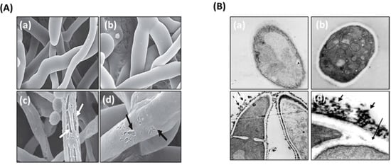 The effect of LH-AuNPs (64 μg/mL) on A. fumigatus hypha was studied using SEM. Untreated filaments were smooth and intact with an identical width (Figure 4A(a,b)). Conversely, variable degrees of cell wall deterioration and damage were observed after treatment with LH-AuNPs. The fungal cell wall exhibited severe pitting, tearing, and penetration in the cytoplasm, with the indication of irregular and rough cell walls, and widespread blebbing. In addition, the hyphae looked distorted, shrunken, and lost structure and rigidity (Figure 4A(c,d)).