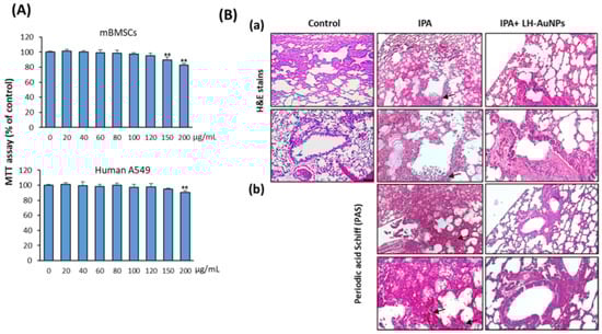 LH-AuNPs repair lung tissue damage in IPA mice. (A) Cytotoxicity of LH-AuNPs on human lung cancer cell line, A549, and primary mBMSCs. The dose-dependent effect of LH-AuNPs on cell viability was measured by MTT assay after 48h of treatment. Values are mean ± SD of three independent experiments (** p < 0.005, compared to control non-treated cells). (B) Histological analysis of lung tissues (3 days post-LH-AuNPs treatment) from control, IPA-non-treated, and IPA-treated mice with LH-AuNPs. Sections stained with H & E (a) and periodic acid–Schiff (PAS) (b). Extensive fungal growth and tissue damage are evident in the non-treated IPA mice. Arrows indicate fungal balls with great density fungi and proliferating hyphae, while there is a lack of fungal balls and hyphae in the lungs of animals with LH-AuNPs treatment.