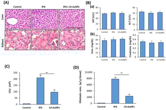 LH-AuNPs suppress fungal burden and gliotoxin production in lung of IPA mice. In vivo cytotoxicity of LH-AuNPs in IPA mice. (A) H & E histological sections of liver and kidney from control, IPA-non-treated, and IPA-treated mice with LH-AuNPs. (B) Serum biochemical markers of liver function (a) AST and ALT and (b) renal function, including urea and creatinine. Biochemical analysis was performed after 3 days of treatment with LH-AuNPs. (C) Effect of LH-AuNPs on fungal load in lung homogenate of IPA mice. (D) Measurements of lung gliotoxin concentration in IPA mice after 3 days of LH-AuNPs. Values are expressed as means ± SD (n = 10 mice/group) (** p < 0.005, compared to control non-treated mice).