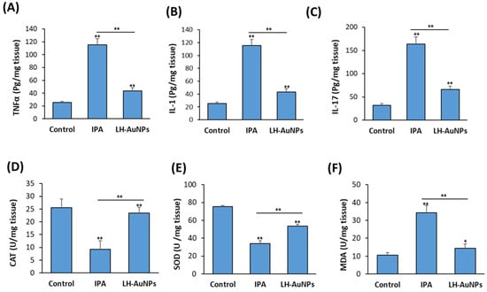 Inhibitory effect of LH-AuNPs on pro-inflammatory cytokines production and oxidative stress in IPA mice. Measurements of inflammatory cytokines, (A) TNF-α, (B) IL-1, and (C) IL-17 after 3 days of LH-AuNPs treatment in IPA mice. Effect LH-AuNPs on the antioxidant enzymes production, including (D) CAT, (E) SOD, and (F) MDA in the lung of IPA mice after 3 days of LH-AuNPs treatment. Data are expressed as means ± SD (n = 10 mice/group). (* p < 0.05 and ** p < 0.005, compared to control non-treated mice).