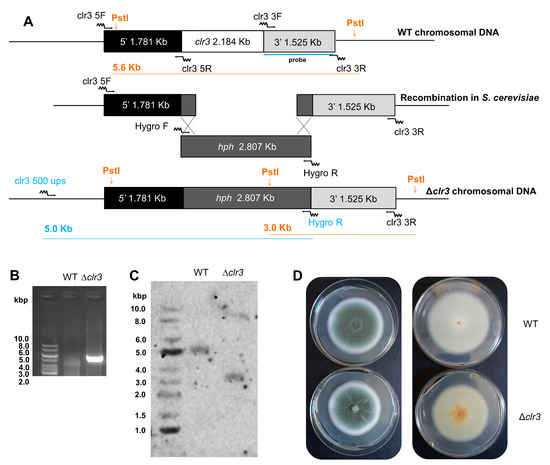 Construction of clr3 deletion mutant. Gene replacement strategy for clr3 deletion, in which the hph gene was used as a selection marker. The primer names and annealing regions are indicated by arrows (primer sequences are described in Table S1). Deletion cassettes were constructed by in vivo recombination in S. cerevisiae (A). Diagnostic PCR was performed to evaluate clr3 loci after gene replacement using primers located 500 bp upstream of the deletion cassette, shown in blue letters and arrows. No amplification was observed in the wild-type (WT) strain (B). Southern blot analysis indicating the hybridization of the probe, which recognizes the region indicated by orange letters and lines (C). Phenotype of the Δclr3 and wild-type (WT) strains grown in PDA at 30 °C for 7 days (D), top (left) and bottom (right) of the colony.