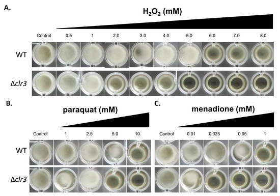 To monitor the growth of the Δclr3 and wild-type strains under oxidative stressing conditions, 1 × 104 conidia of each strain were grown in 200 µL of PD in 96-well plates supplemented with varying concentrations of paraquat, menadione, H2O2, and the crop fungicides fludioxonil and iprodione (Figure 2) [22]. Plates were incubated for 72 h at 30 °C and photographed.