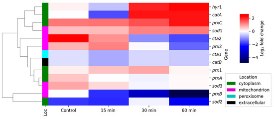 The expression analyses of the above-selected oxidative stress response genes indicate a broad range of results in response to H2O2 treatment (Figure 4). Both up and downregulated genes were identified across different enzyme families, through different time points. To better address our findings, in silico predictors of protein subcellular localization were utilized to look for patterns between enzyme localization and mRNA abundance (Table S3).