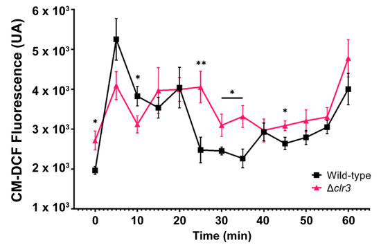 Intracellular ROS levels in the wild-type and mutant strains without (0 min) and after exposure to 5 mM of H2O2. The data represent the average value of eight biological replicates. The error bars represent the standard deviation, * p ≤ 0.05, ** p ≤ 0.01 (one-way ANOVA, significance level 0.05). Both fungal strains were cultivated in minimum media for 24 h in a 96-well plate. H2O2 was added to growth media to a final concentration of 5 mM before incubation with 0.25 mM CM-H2DCFDA probe for 30 min at 30 °C and then washed twice with PBS.