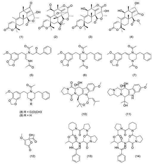 - Geris dos Santos, R.M.; Rodrigues-Fo, E. Meroterpenes from Penicillium sp found in association with Melia azedarach. Phytochemistry 2002, 61, 907–912. [Google Scholar] [CrossRef]