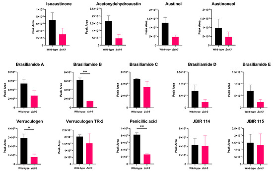 Relative quantification of metabolites in both wild-type and Δclr3 strains. The data represent the average value of two replicates. The error bars represent the standard deviation, * p ≤ 0.05, ** p ≤ 0.01 (unpaired t-test, significance level 0.05).