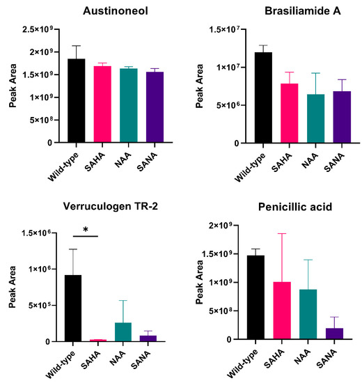 Relative quantification of detected metabolites in extracts from P. brasilianum grown in the presence of suberoylanilide hydroxamic acid (SAHA), nicotinamide (NAA), as well as a mixture of both (SANA). The data represent the average value of two replicates. The error bars represent standard deviation, * p ≤ 0.05 (one-way ANOVA—Tukey’s test, significance level 0.05).