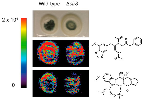 DESI-MSI analyses of wild-type and Δclr3 strains indicated a lower accumulation of brasiliamide A and verruculogen in the colony surface of Δclr3 than in the wild type. Additionally, the DESI-MSI images indicate that the production of these secondary metabolites occurs in both the conidia and hyphal tissue since the detection occurred throughout the colony, including areas of lower conidiation.