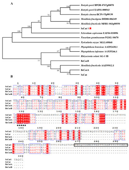 Analysis of the cutinase protein SsCut1. (A) The evolutionary relationship of SsCut1 and its homologs from other fungi determined with the maximum-likelihood algorithm. Branch lengths are proportional to the average probability of change for characters on that branch. The phylogeny was constructed with Mega 6.0 using the neighbor-joining method (parameters: 1000 bootstraps). (B) The amino acid sequence alignment of SsCut1, SsCut, BcCutA and BcCutB. The black stars indicate the conserved GYSQG catalytic site. The rectangle box indicates the conserved CBM1 domain.