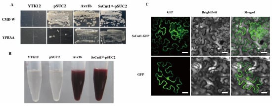 The secretion activity of SsCut1 was analyzed by using the yeast secretion trap assay [61,62]. In this study, the predicted signal peptide fragment of the SsCut1 gene was fused to the N-terminal of secretion-defective invertase gene (suc2) in the vector pSUC2 and Then transformed into the yeast competent strain YTK12. The candidate yeast transformants were cultured on YPDA medium, and selected on CMD-W (Takara, Dalian, China) medium and YPRAA (2% raffinose) medium (Macklin, Shanghai, China). TTC (2, 3, 5-Triphenyte-trazoliumchloride) was used to detect the activity of the secreted sucrase of the candidate yeast transformants. The candidate yeast transformed strain was cultured on sucrose medium, then collected by centrifugation, added with a final concentration of 0.1% TTC reagent, incubated at 35 °C for 35 min, and placed at room temperature for 5 min to observe the color change in the test tube. A positive reaction changes from colorless to dark red. The SPs of Avr1b and YTK12-pUSC2 were used as the positive and negative controls, respectively.