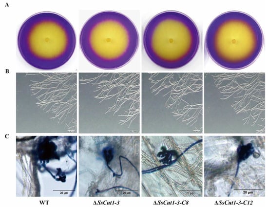 The biological function of SsCut1 in S. sclerotiorum was investigated by generating SsCut1-deletion mutants, using a homologous recombination strategy (Supplementary Figure S2A). Homokaryotic ΔSsCut1 mutants were obtained by single ascospore isolation. Three SsCut1-deletion mutants (ΔSsCut1-1, ΔSsCut1-3 and ΔSsCut1-7) were obtained, and confirmed by PCR and Southern blot analysis. The results showed that the targeted gene was replaced by a single copy marker gene in mutants ΔSsCut1-1 and ΔSsCut1-3 (Supplementary Figure S2B,C). Two complementary transformants, ΔSsCut1-3-C8 and ΔssCut1-3-C12, were generated by introducing wild-type allele to ΔSsCut1-3 mutants using the ATMT method (Supplementary Figure S2D).