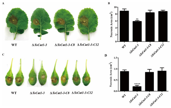 SsCut1 knock-out mutants showing reduced virulence on the detached leaves of oilseed rape and Arabidopsis leaves. (A) Lesions formation on oilseed rape leaves inoculated with wild-type strain (1980) and SsCut1 transformants, the photographs were taken at 48 h post-inoculation (hpi). (B) Statistical results of lesion area on oilseed rape leaves. (C) Lesions formation on A. thaliana leaves inoculated with wild-type strain and SsCut1 transformants, the photographs were taken at 36 hpi. (D) Statistical results of lesion area on A. thaliana leaves. Bars indicate ± SE (n = 4). Statistical significance is indicated in the graph (one-way ANOVA): ** p < 0.01, **** p < 0.0001. The experiments were performed three times with similar results.
