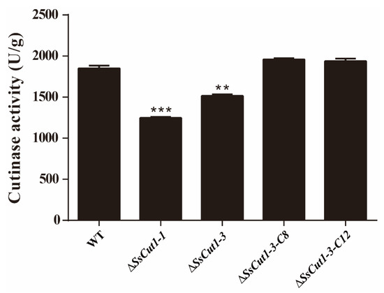Cutinase activity of wild-type strain and SsCut1 transformants. All strains were cultured on PDA medium. The hyphal of wild-type strain and SsCut1 transformants was collected at 36 hpi. Cutinase activity levels were examined with the enzyme-linked immunosorbent assay (ELISA) method. Bars indicate ± SE. Statistical significance is indicated in the graph (one-way ANOVA): ** p < 0.01, *** p < 0.001.