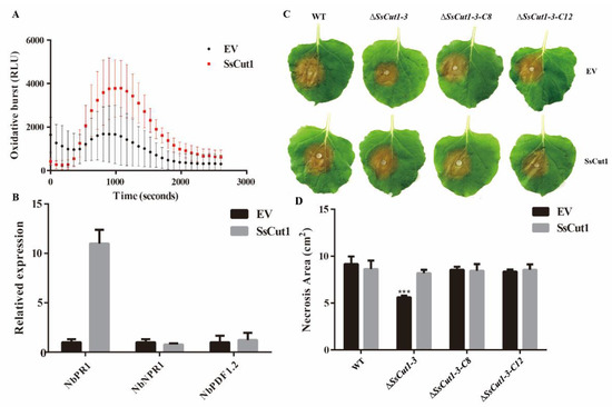 SsCut1 triggers plant defense responses and plays a role in the Sclerotinia–plant interaction. (A) SsCut1 promote flg22-triggered reactive oxygen species burst. The N. benthamiana with SsCut1 and empty vector were treated with 100 µg/mL flg22. Bars indicate ± SE. Error bars represent the SE from ten biological replicates. (B) Induction of defense response genes by SsCut1. SsCut1 induces NbPR1 expression in N. benthamiana. Relative transcript accumulation of NbPR1, NbNPR1, NbPDF1.2 genes determined by RT-qPCR. The transcript level of NbEF1α in N. benthamiana was used to normalize the expression levels in different samples. Error bars represent the SE from three replicates. (C) Expression of SsCut1 in N. benthamiana increases plant susceptibility to the SsCut1 knock-out mutant ΔSsCut1-3. Leaves of N. benthamiana were agroinfiltrated with Agrobacterium tumefaciens containing empty vector or pCNF-SsCut1. The wild-type strain and SsCut1 transformants were inoculated 48 h after agroinfiltration. Photographs were taken at 48 hpi. (D) Statistical results of lesion area on N. benthamiana leaves. In this experiment, four independent replicates were performed. Bars indicate ± SE. Statistical significance is indicated in the graph (one-way ANOVA): *** p < 0.001.