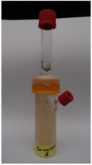 A solid MMNa medium (MMNb with 0.5 g/L (NH4)2HPO4, 2 g/L D-glucose, and without malt extract) [27] was used for axenic T. vaccinum cultures and P. abies–T. vaccinum co-cultivation in a climate chamber with a day/night cycle of 12 h at 23/17 °C at 80% humidity. For separating below-ground from above-ground headspaces, the two chambers were separated by a Teflon cork through which the stem could be passed. The stem was then sealed with agar to prevent the passage of volatiles (Figure 1). The fungus was then inoculated into the lower chamber to allow contact with the root. The volatiles were sampled via inlet Teflon caps using SPME extraction (Supelco, Bellafonte, PA, USA) coated with three different stationary phases (polydimethylsiloxane 100 µm, polydimethylsiloxane/divinylbenzene 65 µm, and divinylbenzene/carboxene/polydimethylsiloxane 50/30 µm). The fibers were conditioned according to the manufacturer instructions. To prepare the fibers for sampling, they were cleaned by inserting them into the inlet of the gas chromatograph (GC) for 5 min at 250 °C.