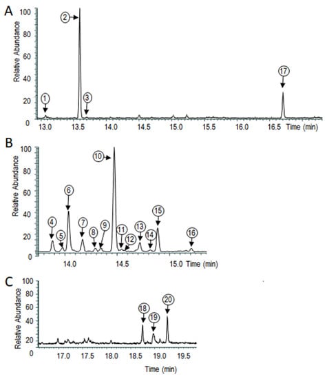 Sesquiterpenes formed by axenic T. vaccinum. (A) The major peaks are visible with the entire spectrum. (B) Enlarged view allows us to differentiate peaks number 4 through 16. (C) Enlarged view of the peaks eluting at higher retention times, numbers 18 through 20. The peaks were numbered consecutively; for each peak a number is given in a small circle above the peak to identify the compound for further analyses. The retention times of the 20 peaks were used for identification with authentic standards, and by mass spectrometry (see Supplementary Table S1). The peak numbers (2) (Δ6-protoilludene), (3) (sativene), (4) (isocaryophyllene), (5) (β-cedrene), (6) (α-barbatene), (7) (β-copaene), (8) (thujopsene), (10) (β-barbatene), (13) (4-epi-α-acoradiene), (15) (chamigrene), and (16) (α-cupraene) could be identified, while peaks (1), (9), (11), (12), (14) and (17)–(20) did not yield an identification (for mass spectra, see Supplementary Figure S1).