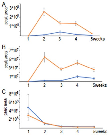 Dynamics of the production of major sesquiterpenes. Quantification in axenic (blue) and ectomycorrhizal (orange) conditions for (2) Δ6-protoilludene (A), (10) β-barbatene (B), and the (17) sesquiterpene ketone (C) are given; n = 5.