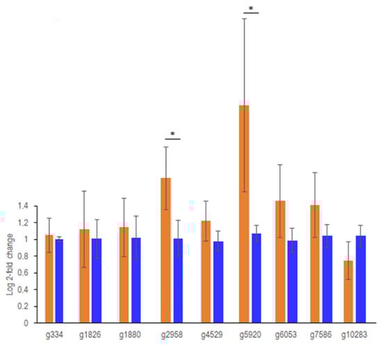 Expression of sesquiterpene synthases with log2-fold changes measured by qRT-PCR in T. vaccinum. Axenic (blue) and mycorrhiza with P. abies (orange) were measured. The gene identifiers for the nine genes, coding for putative sesquiterpene synthases, are given; n = 3. Statistical significance is indicated with a star.