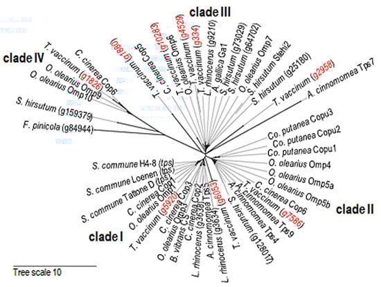Phylogenetic clustering of putative basidiomycete sesquiterpene synthases. The protein sequences identified from the T. vaccinum genome are labeled in red; conceptually translated protein sequences of other basidiomycetes are from Antrodia cinnamomea, Armillaria gallica, Boreostereum vibrans, Coprinopsis cinerea, Coniophora puteana, Fomitopsis pinicola, Lignosus rhinoceros, Omphalotus olearius, Stereum hirsutum, and Schizophyllum commune; gene identifiers are given in brackets if no protein names are available.