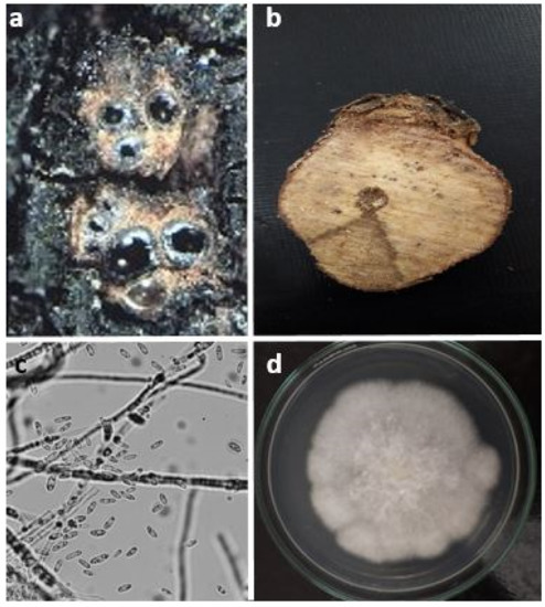 (a) Perithecia materializing the presence of the fungus on the arm of the vine; (b) typical symptoms of eutypiosis on the wood (V-shaped necrotic zone); (c) ascospores of Eutypa lata; (d) cottony white mycelium characteristic of E. lata.