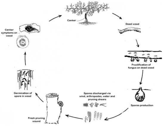 In the Botryosphaeriaceae, 21 different species were declared presently associated with Botryosphaeria dieback, the most frequent species isolated from these different necroses are Diplodia seriata, Diplodia mutila, and Neofusicoccum parvum. They are found on different plants and can cause a large number of dieback events [128,156]. Little information is given on the type of decay they cause in wood and on their enzymatic equipment. D. seriata secretes tyrosol, melleins, mellein derivatives, and 4-hydroxybenzaldehyde [157,158,159]. However, no relationship between pathogenicity and the level of toxins produced has been demonstrated. The life cycle of fungi on the grapevine is poorly known. Sporulation takes place during the vegetative period and seems to be independent of rainfall [160]. The way of entry of these pathogens is uncertain; however, infection via pruning wounds is strongly suspected [9]. They are preserved in the form of pycnidia that are localized either on the vine (trunk, arms, and pruning wounds) or pruning left on the ground [64].
