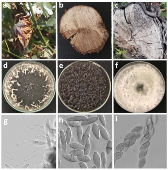 (a) Characteristic symptoms of Botryosphaeria dieback leading to leaf fall; (b) detail brown band and vessels obstructed by yellowish material; (c) grey sectorial necrosis; (d–f) appearance of the mycelia of Botryosphaeria dothidea, Botryosphaeria stevensii and Neofusicoccum parvum after 7 days incubation; (g–i) aspects of conidia of Botryosphaeria dothidea, Botryosphaeria stevensii and Neofusicoccum parvum, respectively.