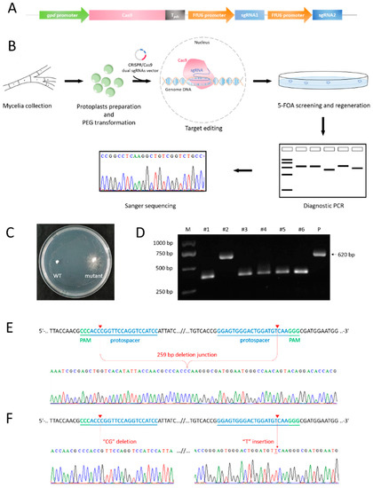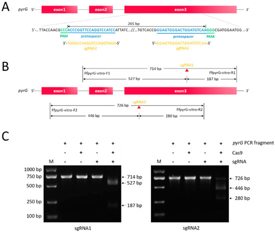To design the sgRNA sequence used in gene editing, the nucleotide sequence of pyrG was uploaded to the online design tool EuPaGD (http://grna.ctegd.uga.edu (accessed on 9 November 2021)). Only those with high scores and “G” at 5′ were chosen as candidate sgRNAs.