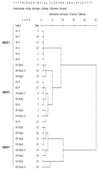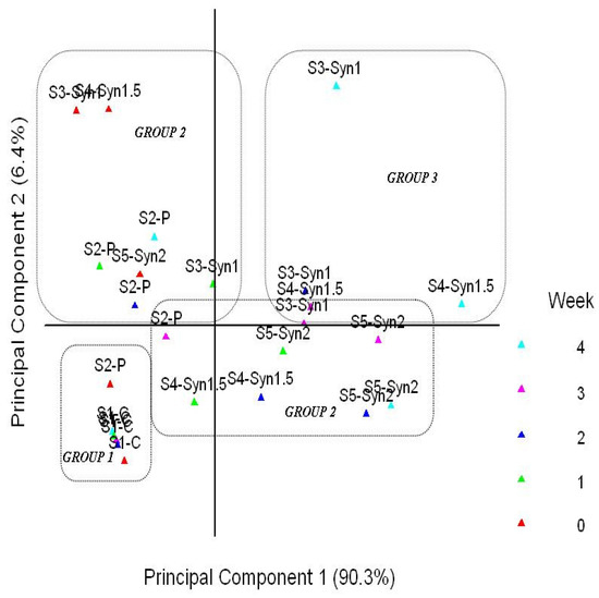 Volatile compounds identified via GC–MS among the different probiotic, synbiotic, and control yogurt samples (S1-C: control plain yogurt; S2-P: yogurt with S. boulardii; S3-Syn1: yogurt with S. boulardii + 1% inulin; S4-Syn1.5: yogurt with S. boulardii + 1.5% inulin; and S5-Syn2: yogurt with S. boulardii + 2% inulin) during four weeks of storage were further analyzed via principal component analysis (PCA) and hierarchical cluster analysis (HCA). Both these multivariate statistical techniques were used for easy interpretation of the volatile compounds’ data from GC–MS. Hierarchical cluster analysis is shown in Figure 1, in which the yogurt samples are divided into three groups, determined by the average linkage among different groups based on Euclidian distance. The principal component analysis explained a total of 96.7% variance, to which principal component 1 (PC1) contributed 90.3%, whereas principal component 2 (PC2) contributed 6.4%, respectively.