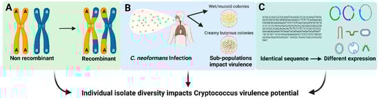 Factors that may contribute to individual isolate variation in Cryptococcus species. (A) Variation in pathogen genetic diversity. (B) Selection of isolate-specific genetic alterations with the host or environment. (C) Gene expression variation across isolates.