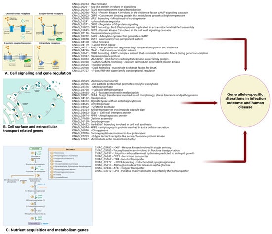 C. neoformans gene alleles identified in GWAS studies as impacting on human disease outcome. Created with BioRender.com.