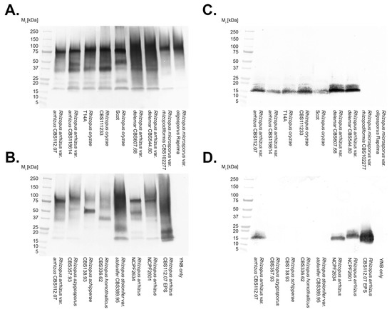 Western blots of culture filtrates from Rhizopus species using pAb SK0078 (A,B) and mAb KC9 (C,D). Though pAb SK0078 binds to antigens with molecular weights of between ~18 kDa to 250 kDa from all Rhizopus spp., mAb KC9 reacts with a single antigen of ~15 kDa, and is species-specific, reacting with different strains of Rhizopus arrhizus var. arrhizus, Rhizopus arrhizus var. delemar, and Rhizopus oryzae only. The positive control, comprising 20 μg of purified EPS from the R. arrhizus var. arrhizus strain, CBS112.07 (B,D), also yields a single KC9-reactive band of ~15 kDa, whereas the negative control, comprising YNB culture medium only, is negative both for pAbSK0078 and for mAb KC9.
