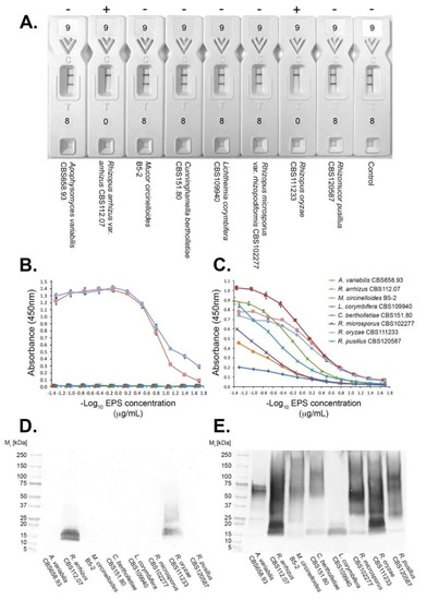 Using purified EPS from human-pathogenic mucoralean fungi, the LFD was shown to be species-specific, detecting Rhizopus arrhizus (syn. R. oryzae) only (Figure 2A). The species-specificity of mAb KC9 was further demonstrated by direct ELISA (Figure 2B) and western blot (Figure 2D) of the purified EPS preparations, with binding to the ~15 kDa antigen of Rhizopus arrhizus (R. oryzae) only. Unlike mAb KC9, pAb SK0078 reacted with all purified EPS preparations in both direct ELISA (Figure 2C) and western blot (Figure 2E), demonstrating the presence of immuno-reactive antigens of between ~18 kDa to ~250 kDa in all eight EPS preparations.