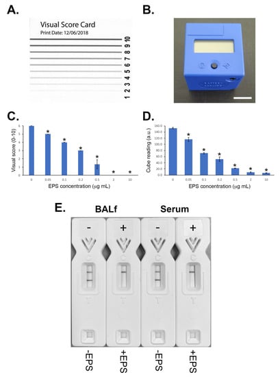 (A) Visual score card used for determinations of LFD test (T) and control (C) line intensities, recorded on a scale of 0–10. (B) Cube reader used for determination of T and C line intensities, recorded as artificial units (a.u.); scale bar = 1.5 cm. (C,D) Sensitivities of the LFD using the visual score card and cube reader systems, respectively. Bars are the means of three replicates ± 2 × SE, and * indicates a significant difference (Student’s t-test (p < 0.05) of mean values compared to the control (running buffer only)). All samples had control (C) line scores of 8 using the score card, and >300 a.u. using the cube reader. (E) Detection of the EPS biomarker in human BALf and serum. Samples were spiked with purified EPS from R. arrhizus var. arrhizus (CBS112.07) to give a final concentration of 80 μg/mL. Note the displacement of the T line with spiked BALf and serum samples, indicating a positive (+) test result. Normal (unspiked) BALf and serum samples gave a negative (−) test result (T lines present).