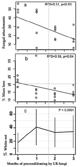 Both the numbers of basidiomycete fungal attachments and mass loss in M. bidentata leaf litter decreased with increasing pre-conditioning time (Figure 2a,b). Linear regression showed that about a third of the variation in fungal attachments was related to preconditioning time, and was significant (R2 = 0.31, p < 0.01). Similarly, preconditioning time was highly significant in the overall ANOVA (Table 1). A 1-way ANOVA for preconditioning time vs. basidiomycete fungal attachment (excluding the gamma irradiation treatment) was also highly significant (p < 0.0001). The largest change in basidiomycete fungal attachments occurred between 0 and 1 month of preconditioning (Figure 2a). Similarly, % white-rot after 6 weeks of decomposition on the litter mats vs. pre-conditioning time was highly significant (1-way ANOVA; p < 0.0001) and the significant change occurred between 0 and 1 month of preconditioning (Figure 2c). The non-parametric ANOVA (Page Test) used to analyze mass loss vs. preconditioning time was significant (p = exactly 0.01) in support of the one-sided hypothesis that mass loss is greater with less preconditioning time.