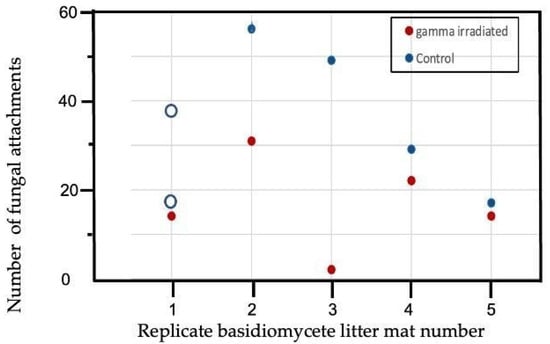 Number of non-unit-restricted basidiomycete attachments to leaves after 6 weeks incubation on Gymnopus johnstonii white-rot leaf litter mats in non-preconditioned leaves of Manilkara bidentata following gamma irradiation versus non-irradiated controls. Number of attachments for the control litter on mat 1 was missing data so a sensitivity analysis was run on the Wilcoxon’s Signed Ranks test using two different estimates of fungal attachments, shown with open circles: 17, the number observed for mat 5 which had similarly low (3–5%) percent white-rot, and 38, which is the mean number of attachments for leaves on the other 4 litter mats.