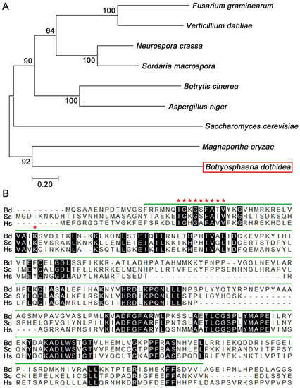 Evolutionary analysis of BdAtg1. (A) Phylogenetic tree of BdAtg1 and other orthologs from fungi, including Fusarium graminearum, Verticillium dahliae, Neurospora crassa, Sordaria macrospora, Botrytis cinerea, Aspergillus niger, Magnaporthe oryzae and Saccharomyces cerevisiae. (B) Sequence alignment of serine-threonine kinase domains form B. dothidea, S. cerevisiae and Humo sapiens. The green overlines indicate the serine-threonine kinase domain and the red asterisks indicate ATP-binding sites.