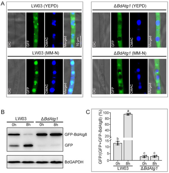 BdAtg1 is indispensable for autophagy. (A) GFP-BdAtg8 localization in the mycelia of the wild-type strain LW03 and BdATG1 deletion mutant ΔBdAtg1 under the conditions of sufficient or lack of nitrogen source. (B) GFP-BdAtg8 proteolysis of each strain (starvation for 0 and 8 h) was detected by Western blotting using anti-GFP antibody. GAPDH was used as an internal reference. (C) The percentage of GFP on the total of GFP and GFP-BdAtg8. Error bars indicate standard deviation from three independent experiments. Values on the bars followed by the same letter are not significantly different at p = 0.05.