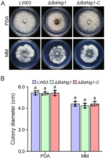 BdAtg1 is involved in mycelial growth. (A) Strains of B. dothidea were grown on PDA and MM media at 25 °C for 3 days. (B) Mycelial growth rate of each strain on PDA and MM media. Error bars indicate standard deviation from three independent experiments. Values on the bars followed by the same letter are not significantly different at p = 0.05.