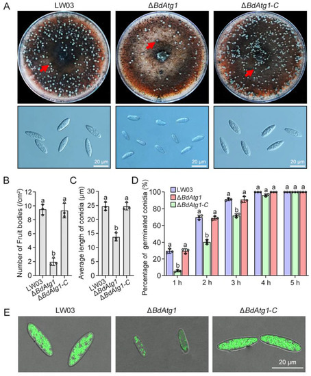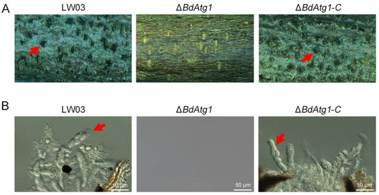 To determine the role of BdAtg1 in conidiation, each strain was cultured on carrot agar medium. After 7 days of incubation with black light exposure at 25 °C, LW03 and ΔBdAtg1-C produced many fruiting bodies containing conidia, while ΔBdAtg1 produced fewer fruiting bodies containing malformed conidia (Figure 4A,B). The average length of the conidia of ΔBdAtg1 was significantly lower than that of LW03 and ΔBdAtg1-C (Figure 4C), and the conidia germination of ΔBdAtg1 was delayed (Figure 4D). In addition, a significant decrease of lipid droplets was observed in ΔBdAtg1 compared to LW03 and ΔBdAtg1-C (Figure 4E).