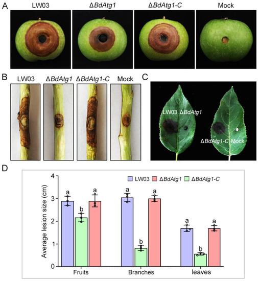 To determine the role of BdAtg1 in virulence, each strain was inoculated to young apple fruits, one-year-old branches and leaves. After 7 days of moisturizing incubation at 25 °C, the disease lesions caused by ΔBdAtg1 were slightly smaller than that of LW03 and ΔBdAtg1-C (Figure 6A). Notably, ΔBdAtg1 almost lost the ability to infect branches and leaves, while LW03 and ΔBdAtg1-C caused severe disease symptoms (Figure 6B–D). These results indicate that BdAtg1 plays a crucial role in plant infection in B. dothidea.